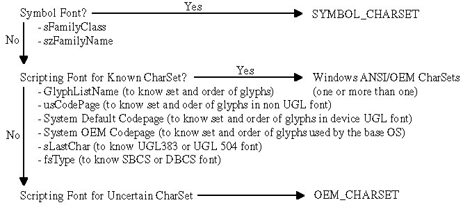If a font is not the symbol font, the font is for scripting text. The font in this category contains known set of glyphs in know order. An OS/2 UGL font supports more than one Windows ANSI CharSet. The Open32 NLS Extension returns all possible Window s ANSI CharSets for each OS/2 UGL font.