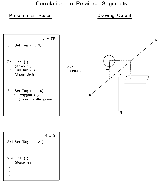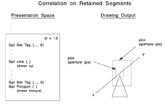 The intersection of a unique segment-identified and -tagged primitive with the pick aperture (pa) produces one hit. If the pick aperture size were increased, there still would be only 1 hit. The triangle produces no hit because its tag is 0.