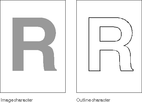 The image character is produced by manipulating pels. The outline character is produced by drawing a sequence of lines and arcs. (The resultant shape of an outline character can be filled if desired.)