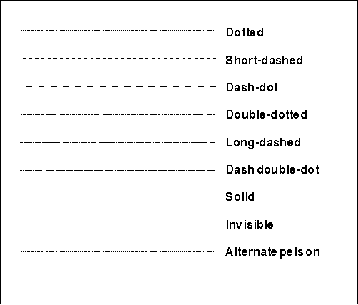 ┌────────────────────────┬────────────────────────┬────────────┐ │Type │Identifer │Long Value │ ├────────────────────────┼────────────────────────┼────────────┤ │Dotted line │LINETYPE_DOT │1L │ ├────────────────────────┼────────────────────────┼────────────┤ │Short-dashed line │LINETYPE_SHORTDASH │2L │ ├────────────────────────┼────────────────────────┼────────────┤ │Dash-dot line │LINETYPE_DASHDOT │3L │ ├────────────────────────┼────────────────────────┼────────────┤ │Double-dotted line │LINETYPE_DOUBLEDOT │4L │ ├────────────────────────┼────────────────────────┼────────────┤ │Long-dashed line │LINETYPE_LONGDASH │5L │ ├────────────────────────┼────────────────────────┼────────────┤ │Dash-double-dot line │LINETYPE_DASHDOUBLEDOT │6L │ ├────────────────────────┼────────────────────────┼────────────┤ │Solid line │LINETYPE_SOLID │7L │ ├────────────────────────┼────────────────────────┼────────────┤ │Invisible line │LINETYPE_INVISIBLE │8L │ ├────────────────────────┼────────────────────────┼────────────┤ │Alternate pels on │LINETYPE_ALTERNATE │9L │ └────────────────────────┴────────────────────────┴────────────┘