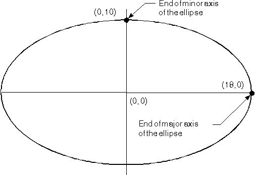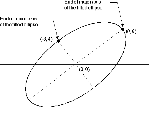 You also can define a tilted ellipse as the current arc. None of the current arc parameters for a tilted ellipse will be 0, though you should still ensure that the axes of the ellipse are at right-angles to each other. The following figure shows a tilted ellipse defined with current arc parameters of (8,6) and (-3,4).