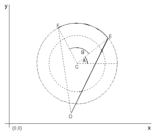 A is the start angle; B, the sweep angle. C is the center point; D, the current position. Arc.EF is the partial arc. F is the new current position. The inner circle in the previous figure is the arc defined by the current arc parameters. A multiplier has been specified with GpiPartialArc, so the partial arc is based on the full arc described by the outer circle. Point C is the center point specified on GpiPartialArc. Angle A is the start angle, and angle B is the sweep angle. GpiPartialArc therefore, draws a line from the current position (point D) to the start of the partial arc (point E). It also draws arc EF. Point F is the new current position. The arc is drawn counterclockwise because the current arc parameters define a counterclockwise circle. You can join points F and D with GpiLine. This line is drawn automatically if you define the partial arc within a GpiBeginArea and GpiEndArea bracket.