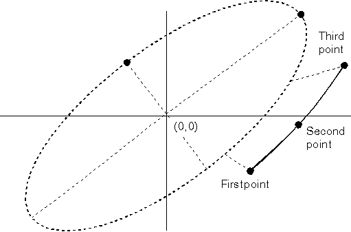 If the current arc parameters define an ellipse, that ellipse is scaled up or down to fit the three points of the arc.