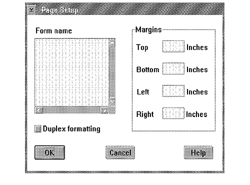 The page setup dialog is concerned with formatting options for the document. The user must be able to specify the form name, margins, and other application-specific formatting options such as page duplexing; that is, different formats for left and right pages in a multi-page document.