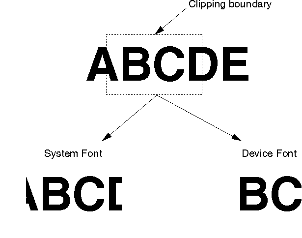When an application uses device fonts, and the output mixes text and graphics pictures, the device fonts are clipped per character. System fonts give more precise clipping to the pel. The following figure illustrates the results from clipping two lines of text: one generated in a system font; the other, in a device font.