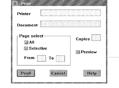 The Printer entry field is the read-only name of the printer object (queue) that the user chose from the Printer Setup dialog. The Preview checkbox is used to preview the printed output on the screen. This can be achieved by opening an OD_MEMORY device context to the printer driver and drawing the picture into the bit map. A BITBLT (Bit Block Logical Transfer) to the screen shows the resultant page. System fonts should be used instead of device fonts.