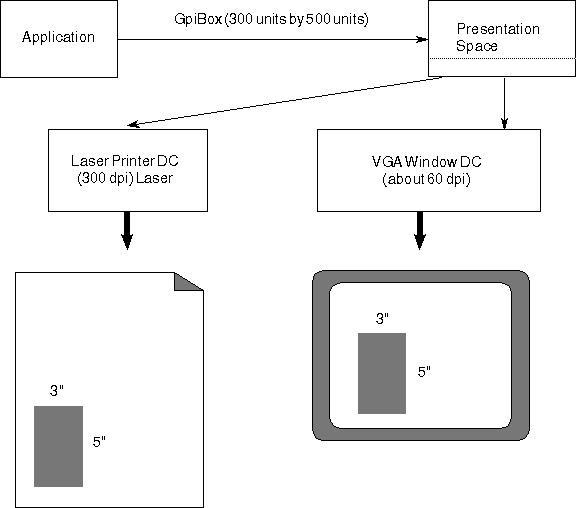 An application must be designed around the options provided by the PM to ensure device independence, as a display (VGA) typically is 96 dpi, while a printer typically is 300 dpi.