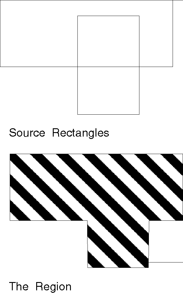 The following figure shows a region that consists of two intersecting rectangles. An application defined the region by passing an array containing the coordinates for the two rectangles to GpiCreateRegion. The application then drew the region with GpiPaintRegion.