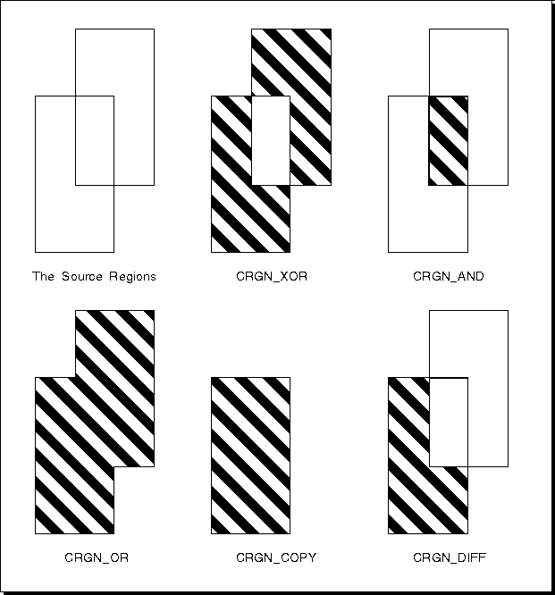 The source regions are two overlapping rectangles. The regions that result from the various combine operations are shown as shaded areas.