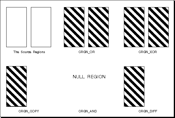 The two source regions do not overlap. The regions that result from the various combine operations are shown as shaded areas. The result from a CRGN_AND combining of separate regions is a NULL region.