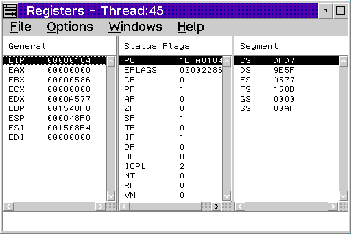 In the Registers window, floating-point registers display as floating-point decimal numbers. They can be updated with a floating-point decimal number or with a hexadecimal string that represents a floating-point number.